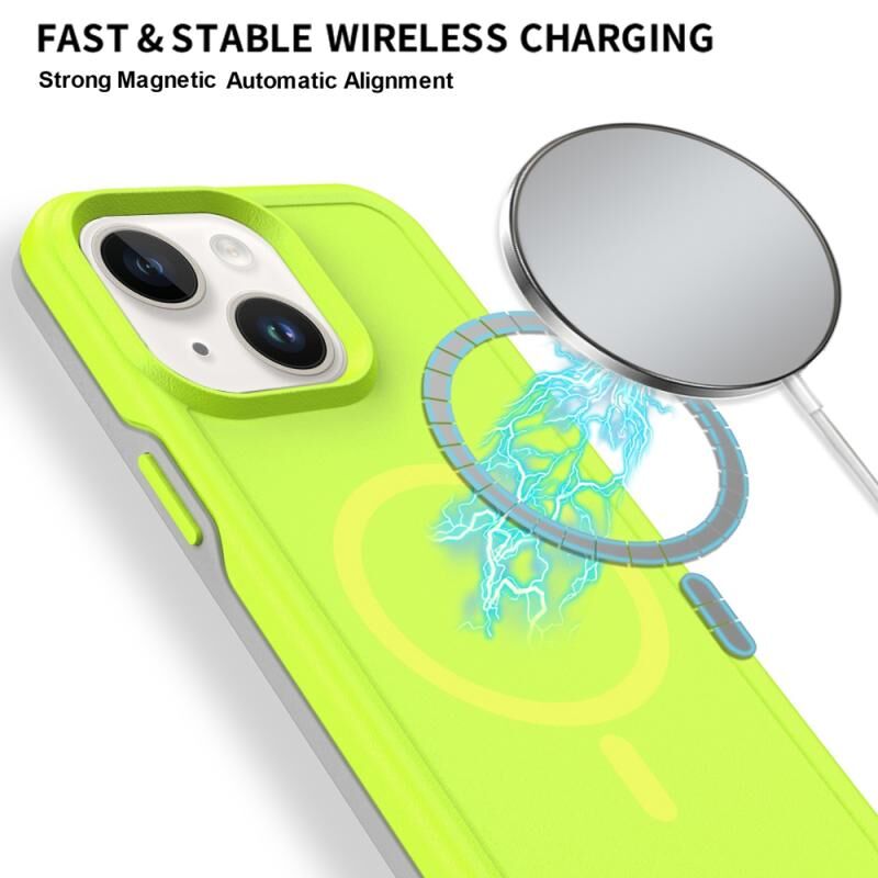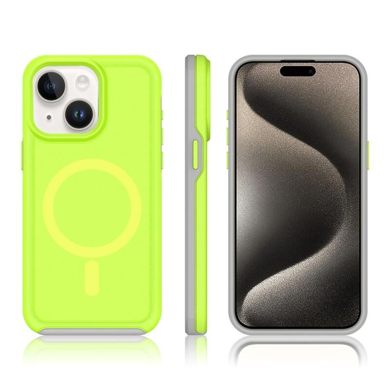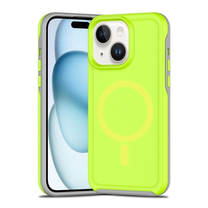 For iPhone 15 Shockproof MagSafe Armor PC Hybrid TPU Phone Case(Fluorescent Green+Gray)