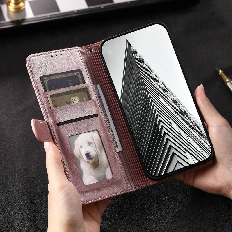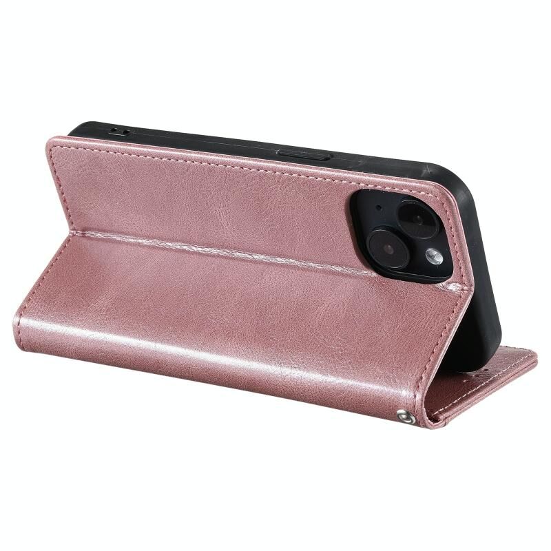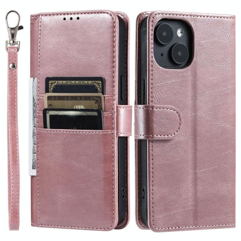 Θήκη τηλεφώνου από δέρμα για iPhone 15, απλή, για 6 κάρτες (Χρυσό ροζ)