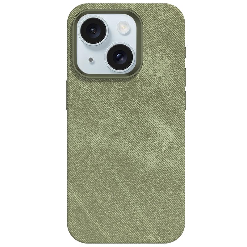 For iPhone 15 Skin Feel Denim Leather MagSafe Phone Case(Khaki Green)