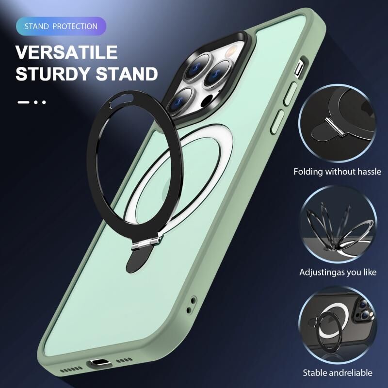 6. Περιστρεφόμενη Βάση Δακτυλιδιού 360: Με έναν συμπαγή και πρακτικό σχεδιασμό, συνδυάζουμε απρόσκοπτα την ισχυρή τεχνολογία MagSafe με μια αναδιπλούμενη βάση. Η ενσωματωμένη βάση στήριξης περιστρέφεται αβίαστα 360 μοίρες και αναδιπλώνεται 120 μοίρες, προσφέροντάς σας την ιδανική γωνία θέασης τόσο σε οριζόντιο όσο και σε κάθετο προσανατολισμό. Όταν είναι διπλωμένη, ευθυγραμμίζεται απρόσκοπτα με την πλάτη της θήκης, διατηρώντας ένα λεπτό προφίλ για εύκολη τοποθέτηση στην τσέπη.