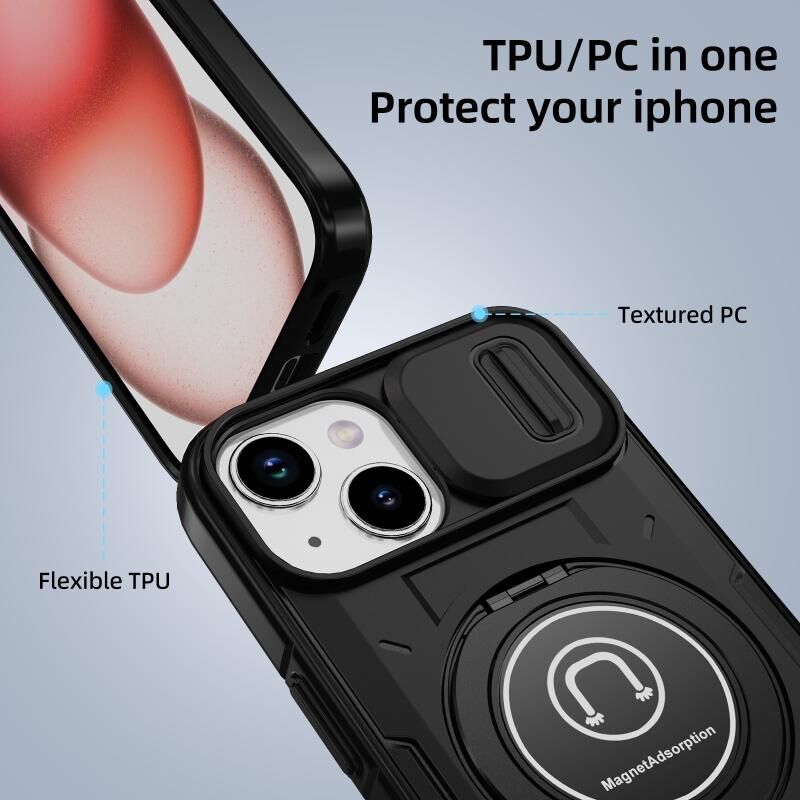 For iPhone 15 Sliding Camshield TPU Hybrid PC Magnetic Holder Phone Case(Black)