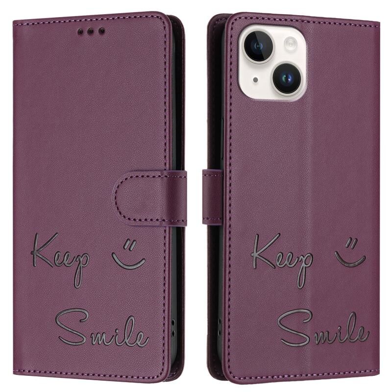 Θήκη τηλεφώνου δερμάτινη με ανάγλυφο χαμόγελο και προστασία RFID για iPhone 15 (Μωβ)