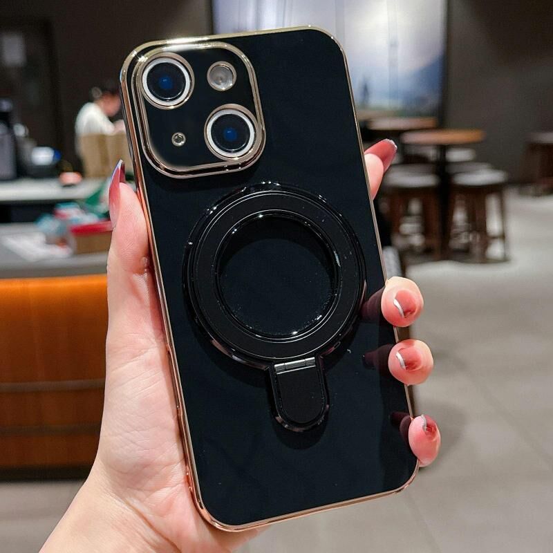 For iPhone 15 Solid Color Electroplated Metal Holder Phone Case(Black)
