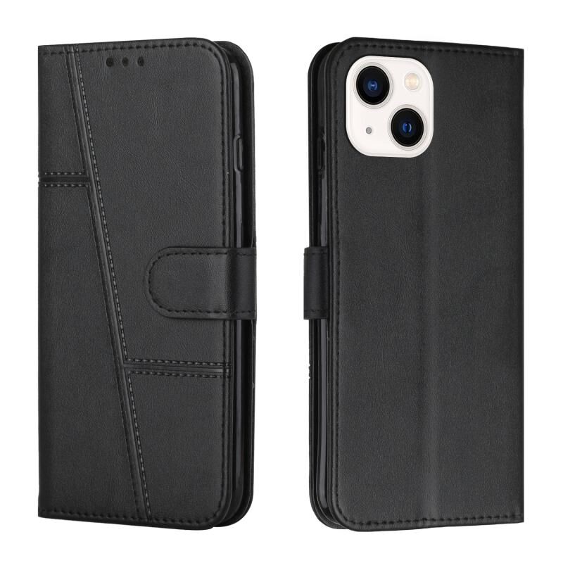 Θήκη τηλεφώνου για iPhone 15 από δέρμα μοσχαριού με ραφές και αγκράφα (Μαύρο)