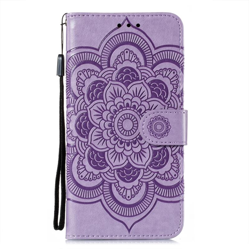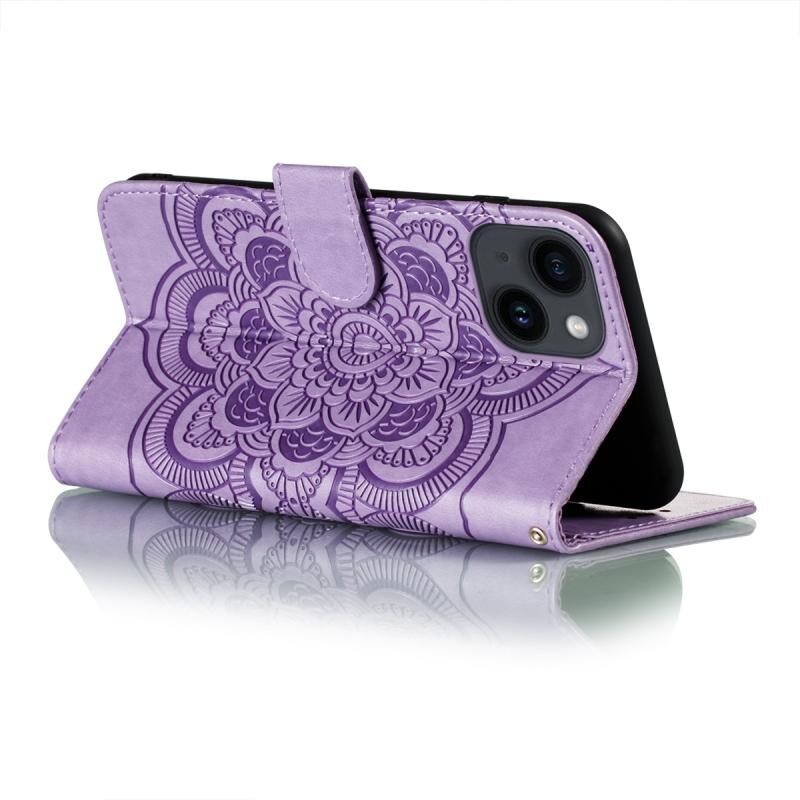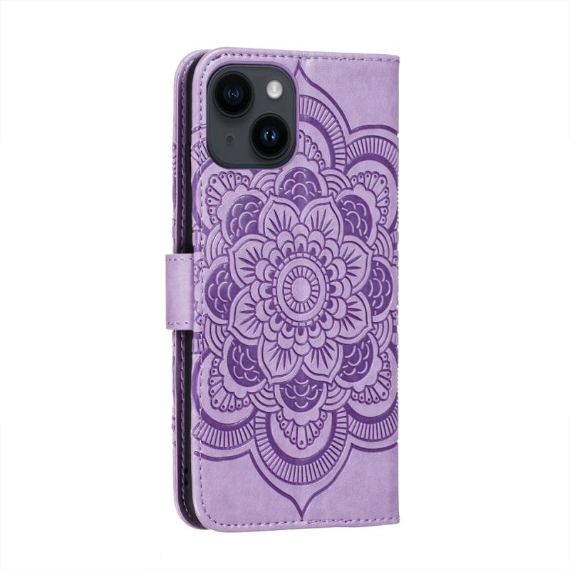 Θήκη τηλεφώνου από δέρμα με ανάγλυφο Sun Mandala για iPhone 15 (Μωβ)