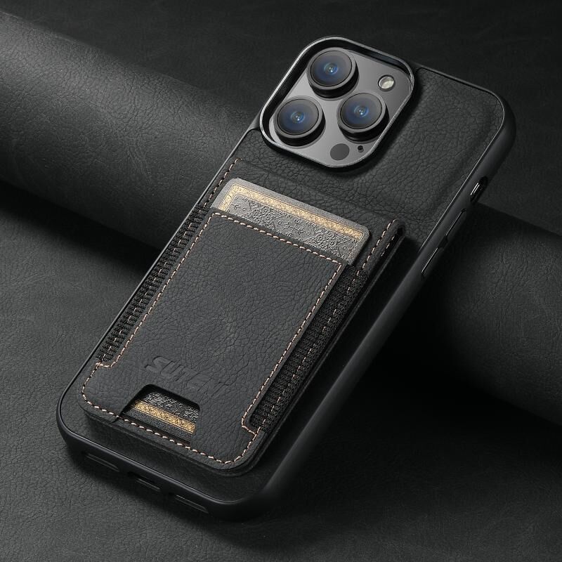 Θήκη κινητού τηλεφώνου Suteni H03 για iPhone 15 από δέρμα Litchi με θήκη για κάρτες και βάση στήριξης (Μαύρο) (Suteni)