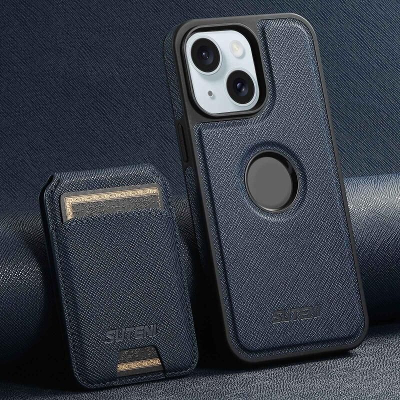For iPhone 15 Suteni M2 Cross-Grain MagSafe Vertical Card Back Phone Case(Blue) (Suteni)