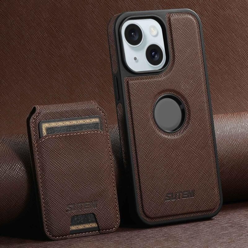 For iPhone 15 Suteni M2 Cross-Grain MagSafe Vertical Card Back Phone Case(Brown) (Suteni)