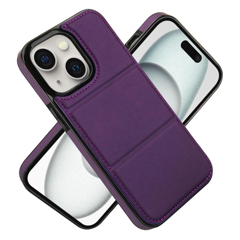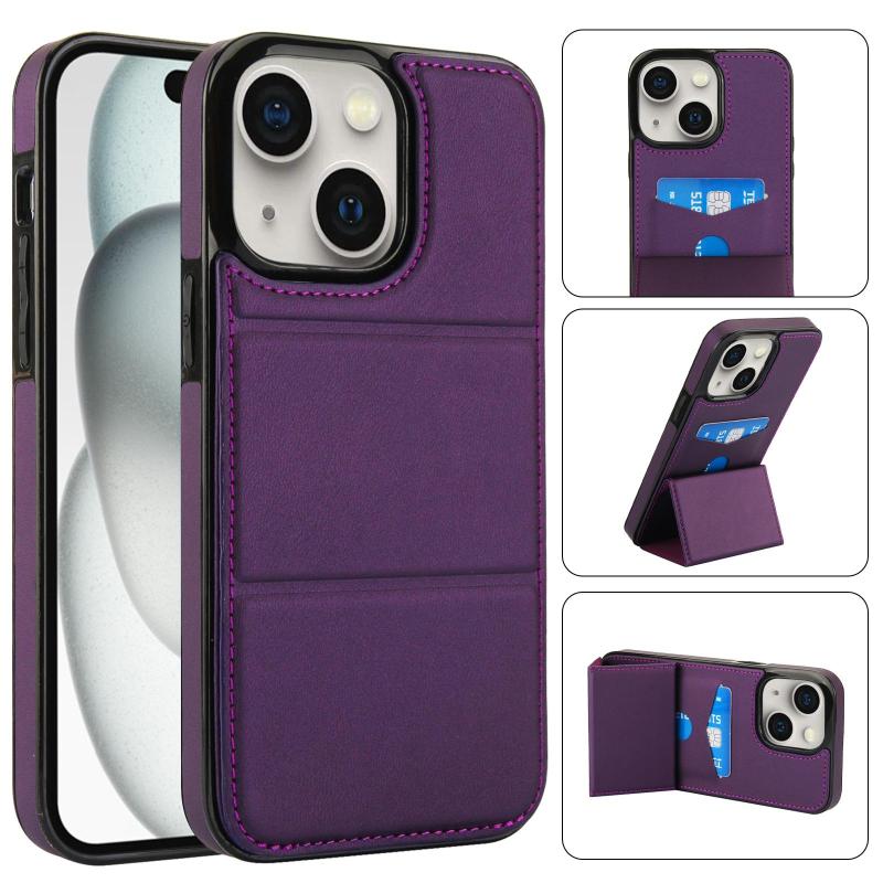 For iPhone 15 Tri-fold Holder Leather Phone Case with Card Slot(Dark Purple)