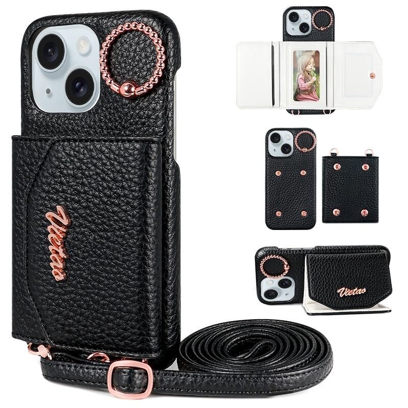 For iPhone 15 VIETAO Ring Holder Card Bag Phone Case with Lanyard(Black) (VIETAO)