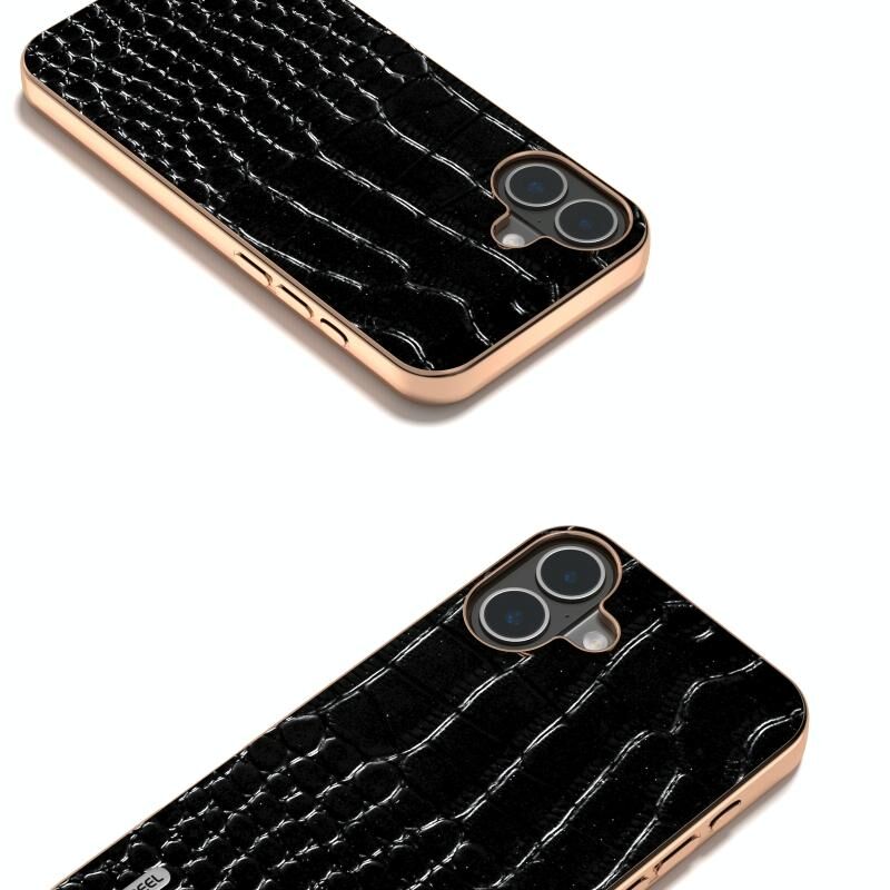Θήκη τηλεφώνου για iPhone 16 ABEEL με ηλεκτρολυτικό πλαίσιο και γνήσιο δέρμα με μοτίβο κροκόδειλου (Μαύρο)