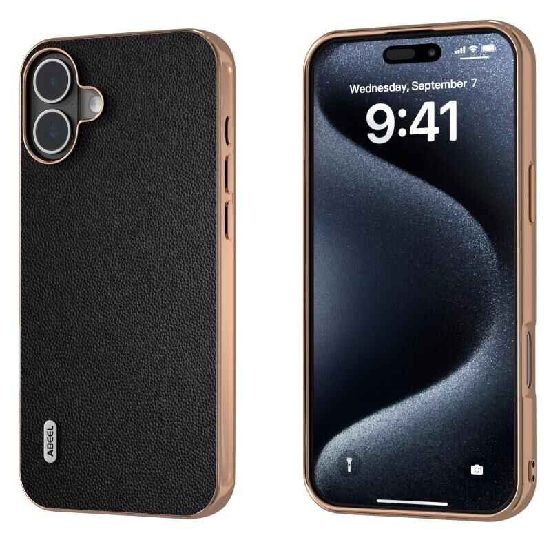 For iPhone 16 ABEEL Electroplated Frame Genuine Leather Elegant Phone Case(Black)