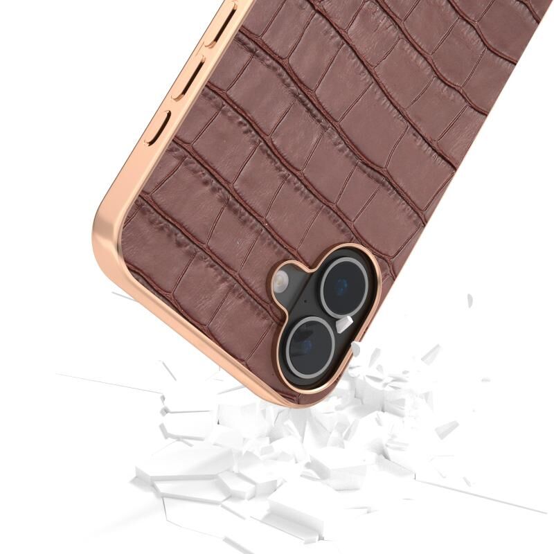 For iPhone 16 ABEEL Electroplating Frame Crocodile Texture Genuine Leather Phone Case(Brown)