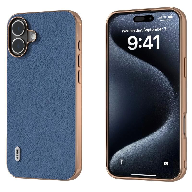 For iPhone 16 ABEEL Electroplating Frame Genuine Leather + PC Litchi Texture Phone Case(Blue)