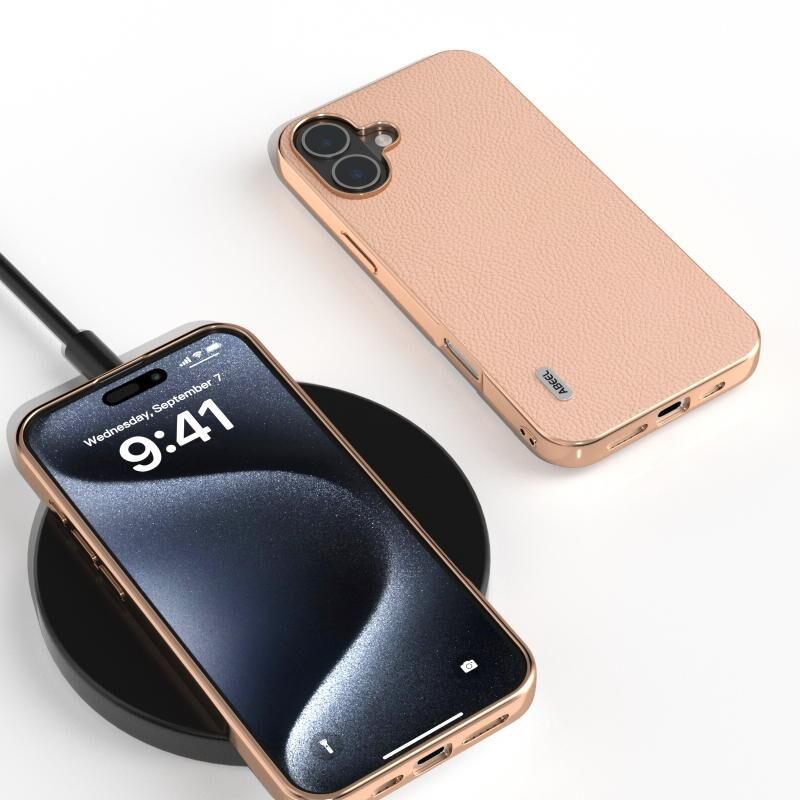For iPhone 16 ABEEL Electroplating Frame Genuine Leather + PC Litchi Texture Phone Case(Pink Gold)