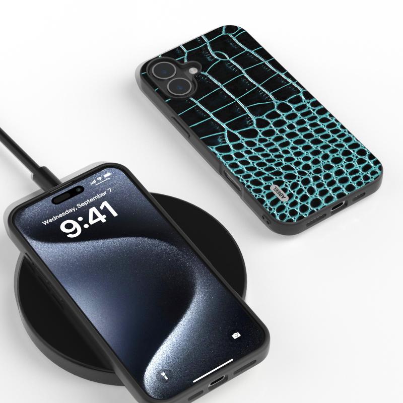 For iPhone 16 ABEEL Genuine Leather Crocodile Pattern Black Edge Phone Case(Blue)