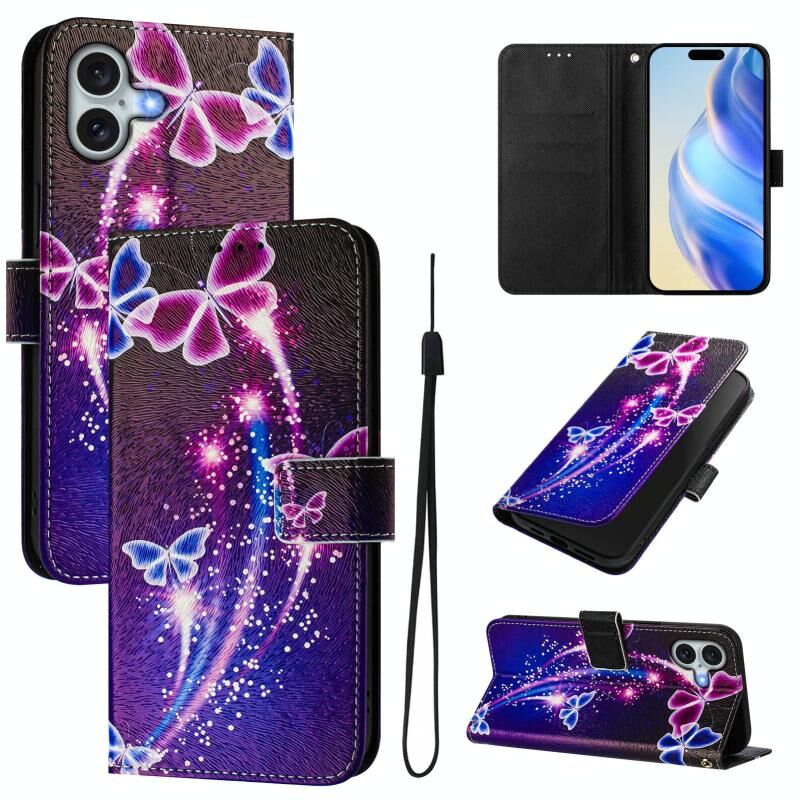 For iPhone 16 Art Colored Drawing Pattern Leather Phone Case(Fireworks butterfly)