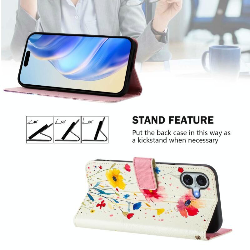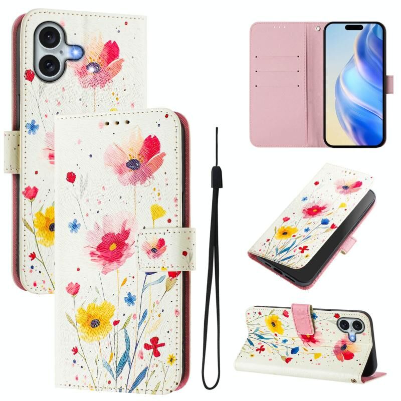 For iPhone 16 Art Colored Drawing Pattern Leather Phone Case(Flowers and plants)