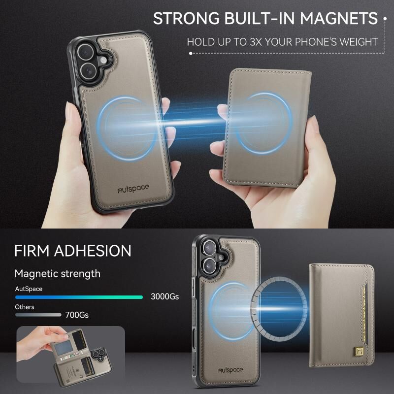 For iPhone 16 AutSpace A13 MagSafe Magnetic RFID Flip Card Bag Phone Case(Grey) (AutSpace)