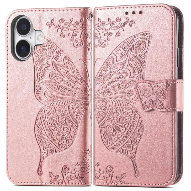 For iPhone 16 Butterfly Love Flower Embossed Leather Phone Case(Rose Gold)