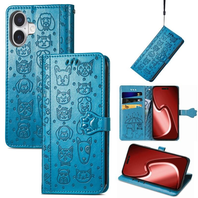 For iPhone 16 Cat and Dog Embossed Leather Phone Case(Blue)