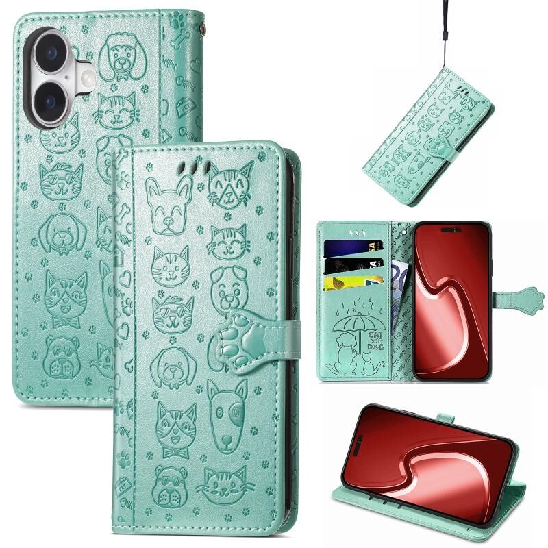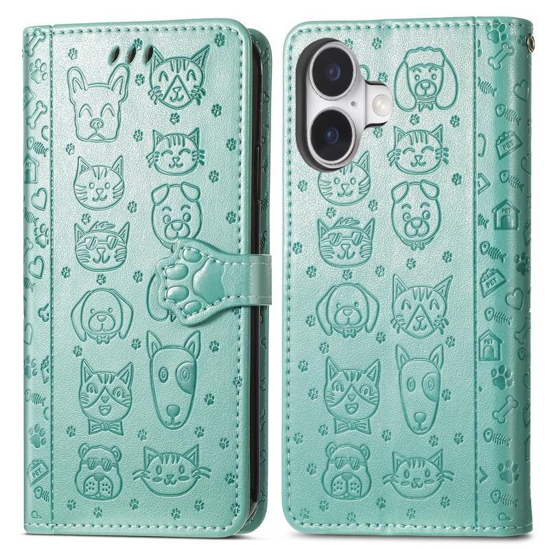 For iPhone 16 Cat and Dog Embossed Leather Phone Case(Green)
