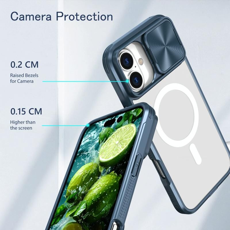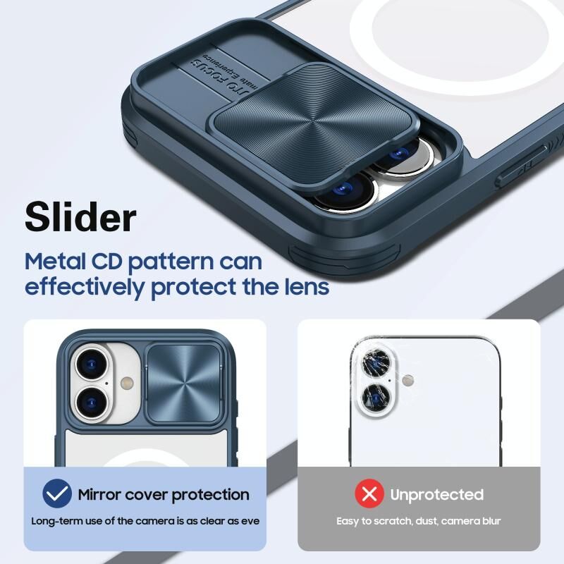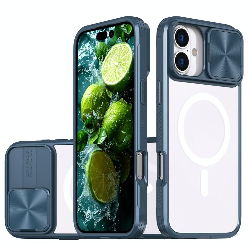 Θήκη κινητού τηλεφώνου πλήρους κάλυψης για iPhone 16, διαφανές ακρυλικό + PC + TPU, με συρόμενο κάλυμμα φακού MagSafe (Ναυτικό Μπλε)