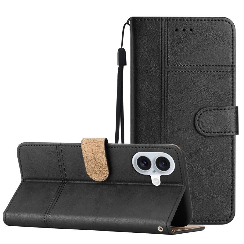 For iPhone 16 Cowhide Texture Stitching Leather Phone Case(Black)