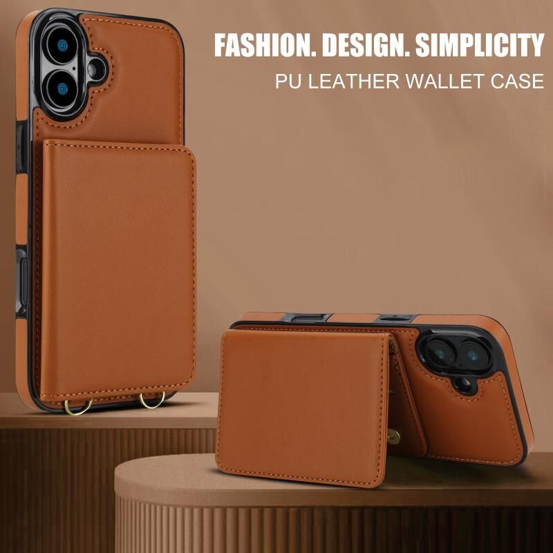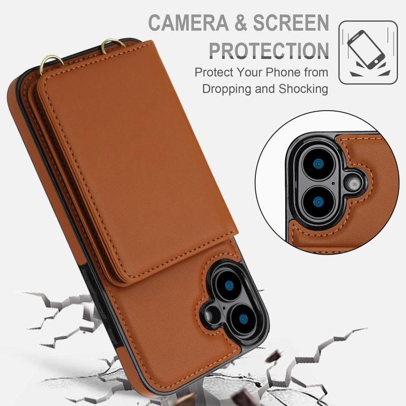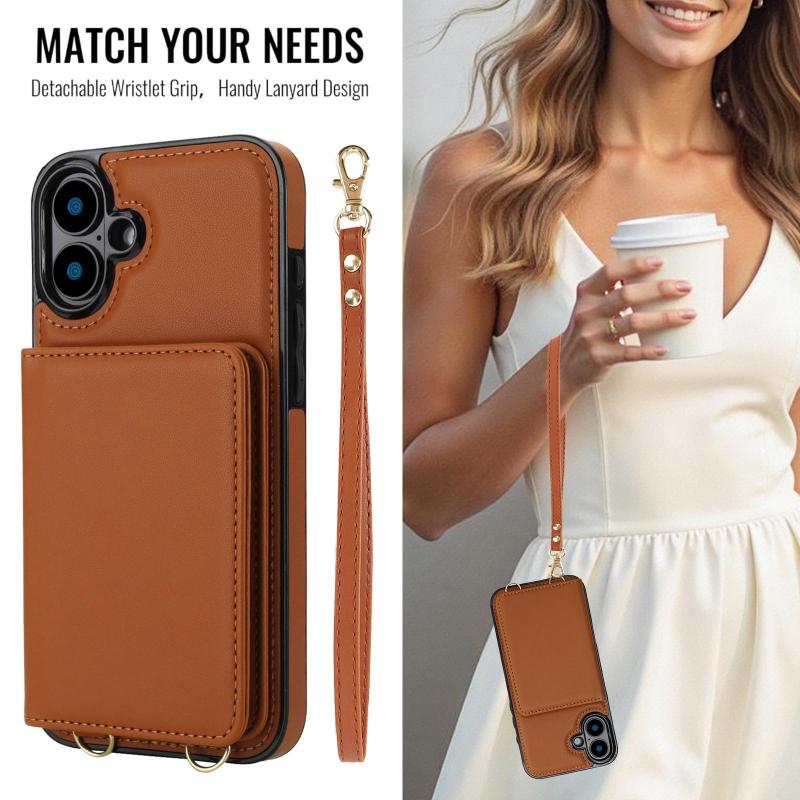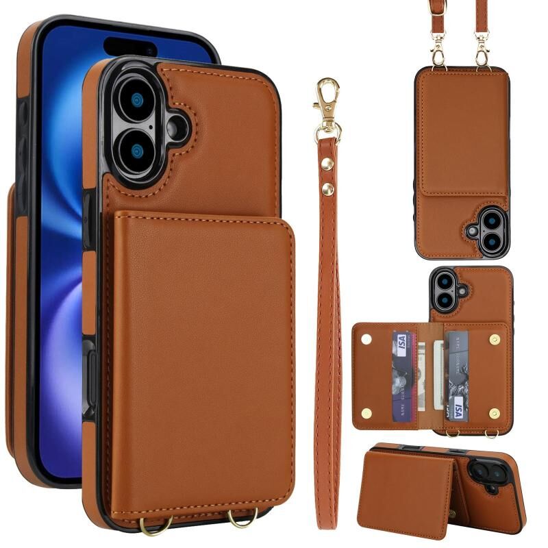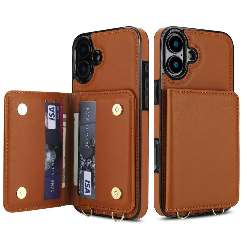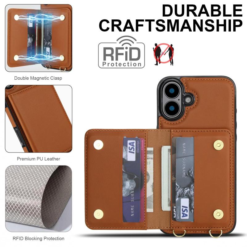 For iPhone 16 Crossbody Dual-buckle Wallet RFID Back Leather Phone Case(Brown)