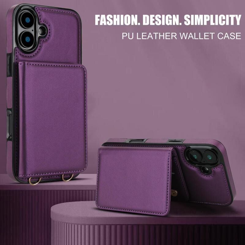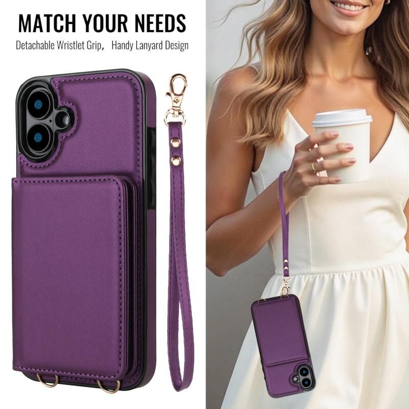For iPhone 16 Crossbody Dual-buckle Wallet RFID Back Leather Phone Case(Dark Purple)