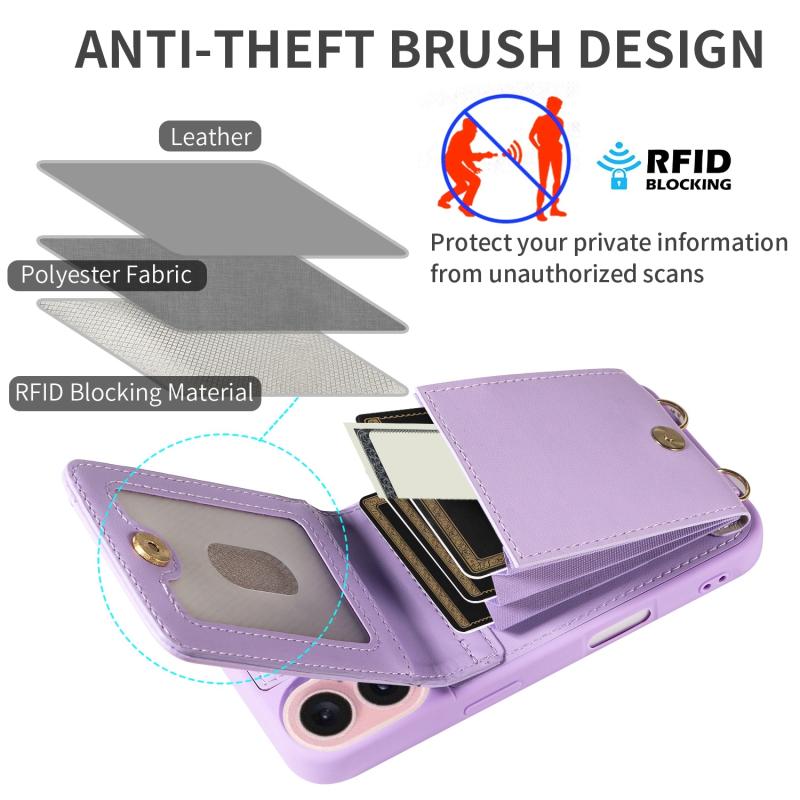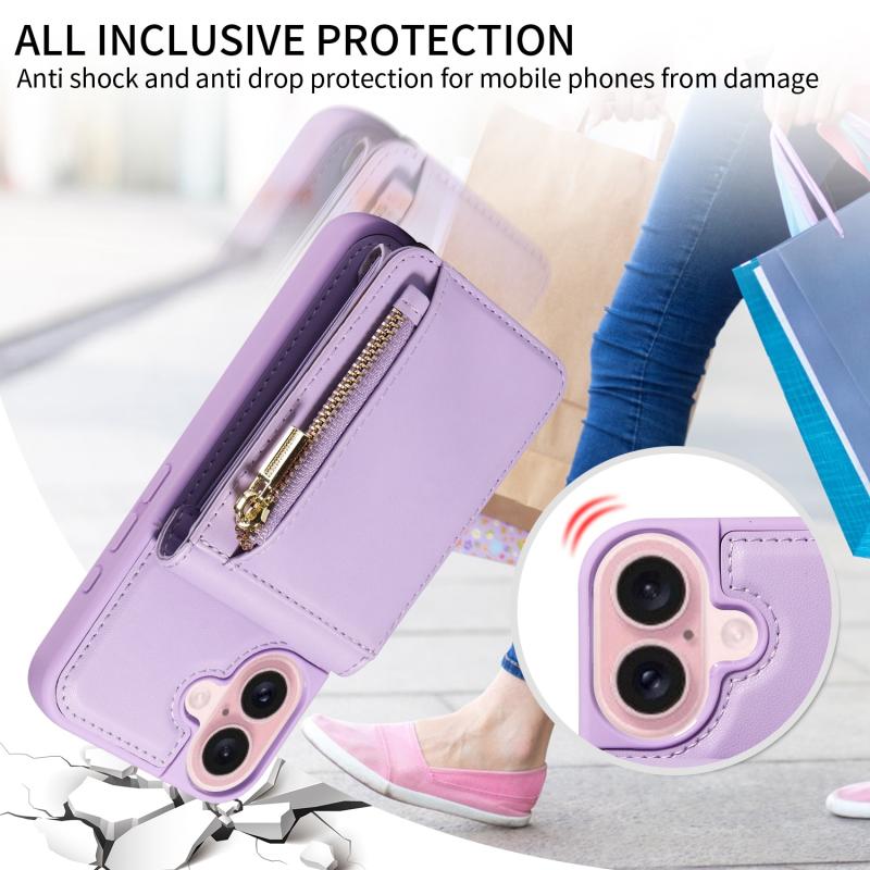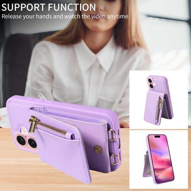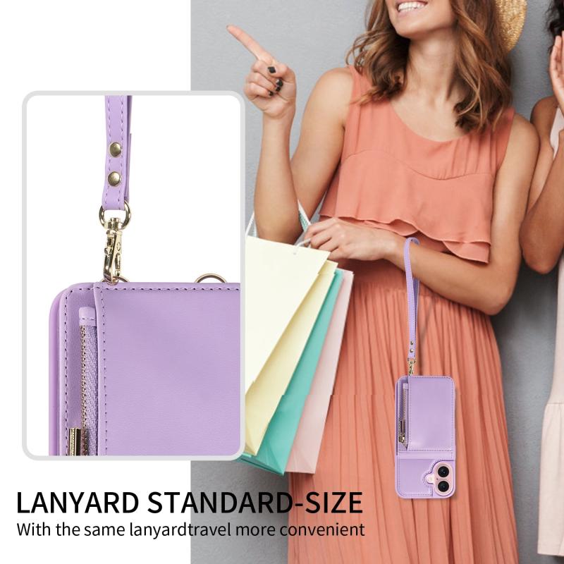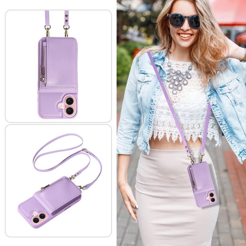 Θήκη τηλεφώνου δερμάτινη με λουρί λαιμού και φερμουάρ, για iPhone 16 (Μωβ)