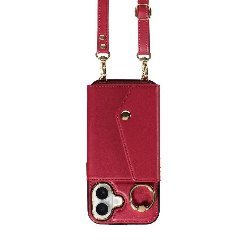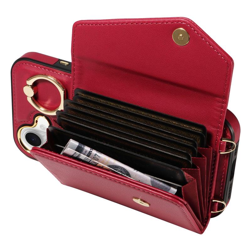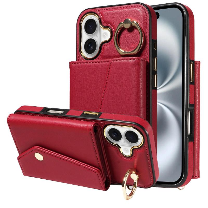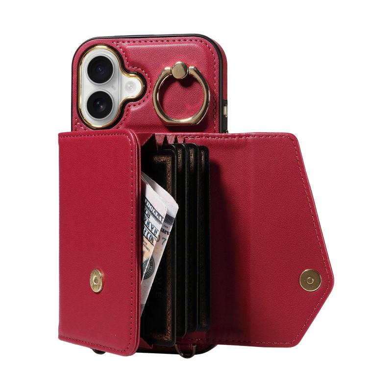 For iPhone 16 Diagonal Crossbody Ring Organ Wallet Leather Back Phone Case(Wine Red)