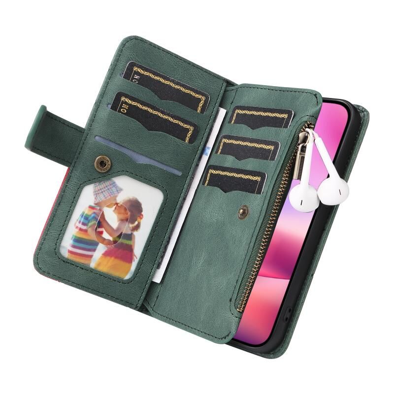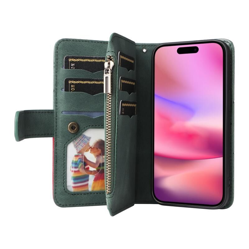 For iPhone 16 Dual-color 9 Card Slots Zipper Wallet Leather Phone Case(Green)