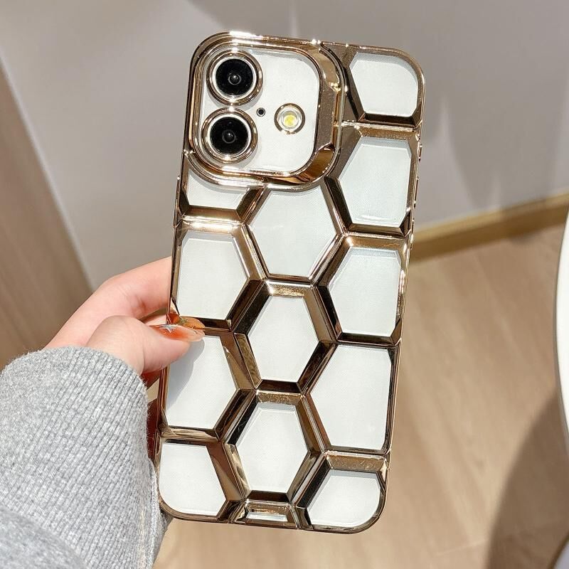 For iPhone 16 Electroplating Laser Engraving 3D Honeycomb Clear TPU Phone Case(Gold)