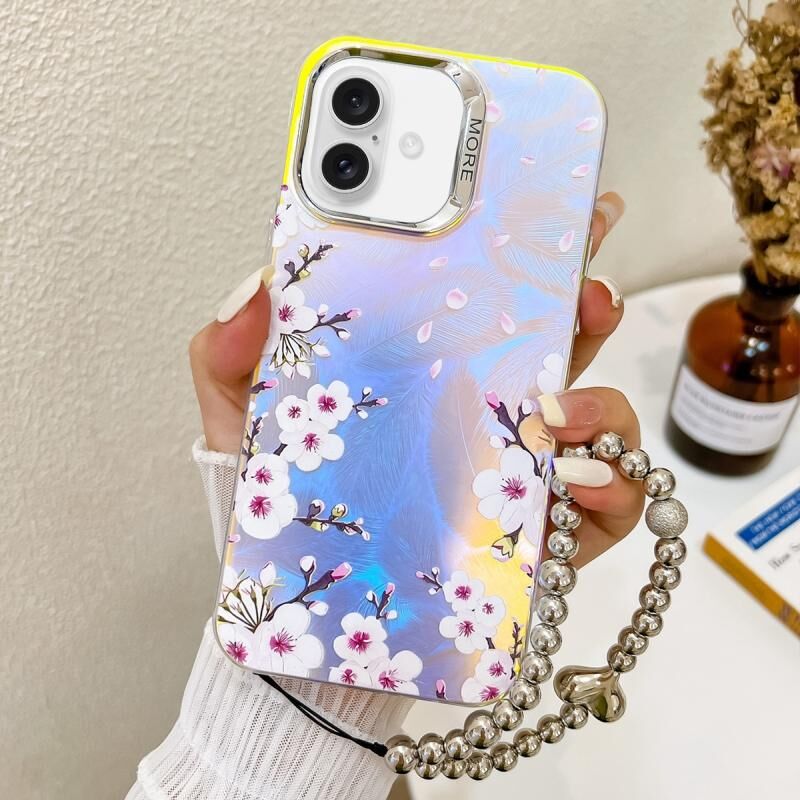 Θήκη τηλεφώνου με ηλεκτρολυτική επίστρωση και λουλούδι λέιζερ για iPhone 16 με λουρί καρπού (Δαμασκηνιά AH18)