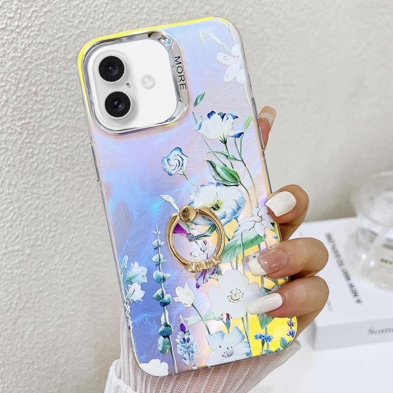 Θήκη τηλεφώνου TPU με δακτύλιο στήριξης και λουλούδι με λέιζερ και ηλεκτρολυτική επικάλυψη για iPhone 16 (Λευκό Λουλούδι AH10)