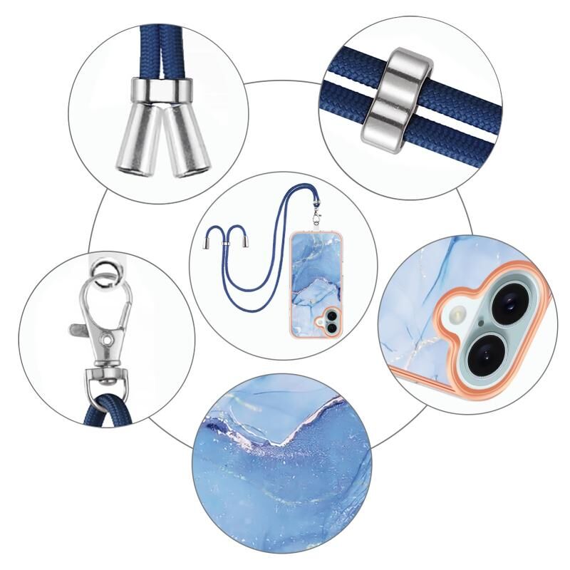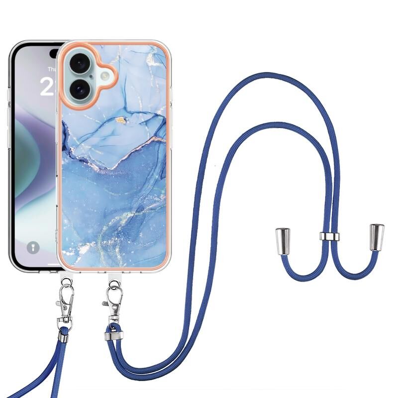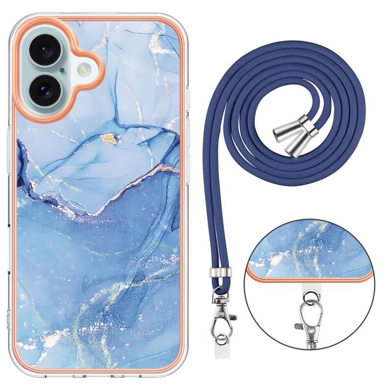 For iPhone 16 Electroplating Marble Dual-side IMD Phone Case with Lanyard(Blue 018)