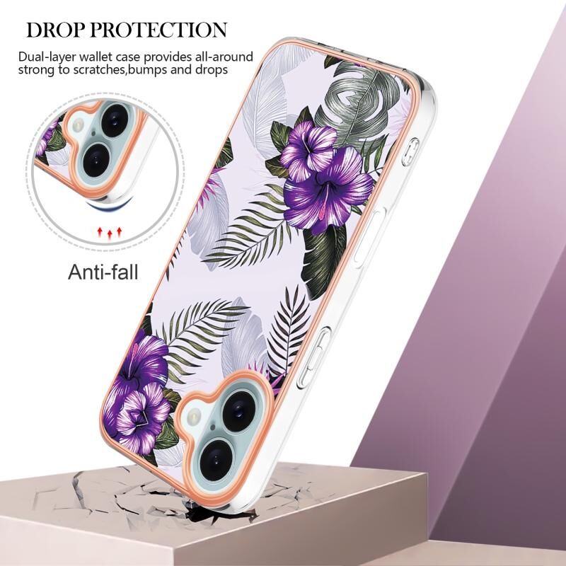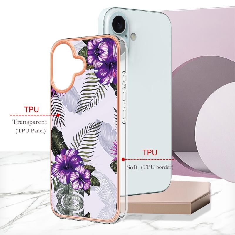 For iPhone 16 Electroplating Pattern IMD TPU Shockproof Case(Purple Flower)