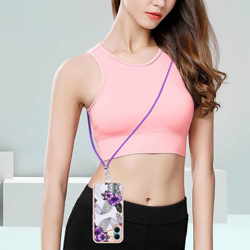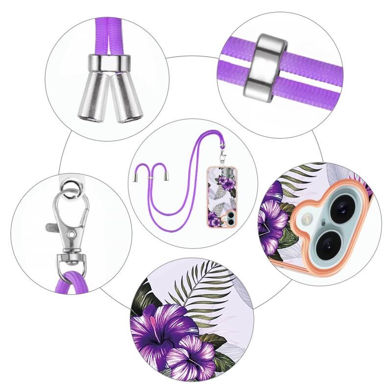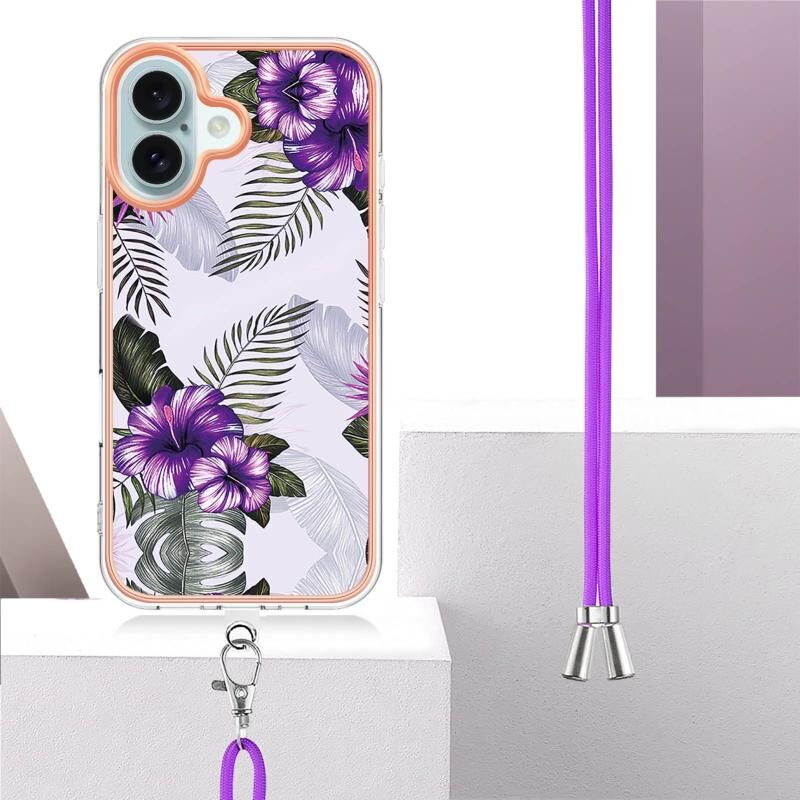 For iPhone 16 Electroplating Pattern IMD TPU Shockproof Case with Neck Lanyard(Purple Flower)