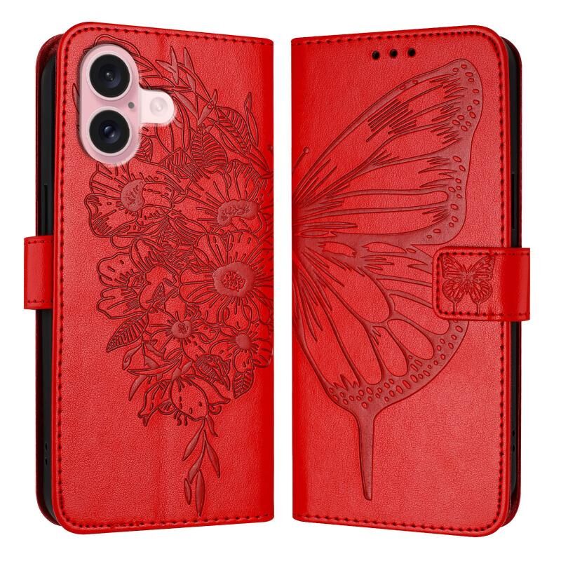 Θήκη τηλεφώνου από δέρμα με ανάγλυφο σχέδιο πεταλούδας για iPhone 16 (Κόκκινο)