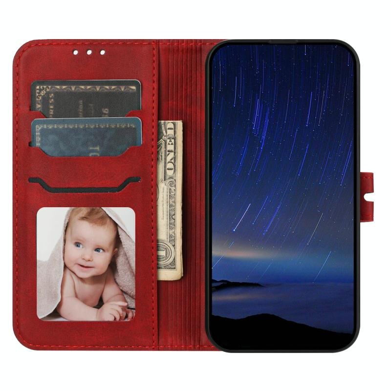 Για το iPhone 16 ανάγλυφο ευτυχισμένη γάτα μοτίβο Flip υπόθεση τηλεφώνου δέρμα (κόκκινο)