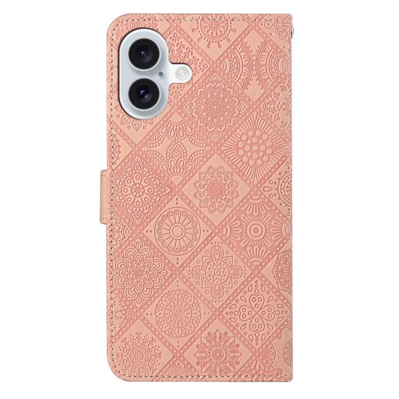 Για iPhone 16 Ethnic στυλ ανάγλυφο μοτίβο δερμάτινη θήκη τηλεφώνου (ροζ)