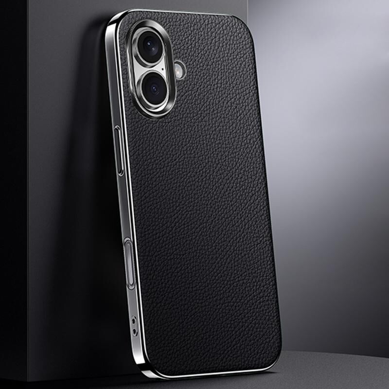 Θήκη τηλεφώνου για iPhone 16, Πρώτης ποιότητας δέρμα αγελάδας με ηλεκτρολυτική επίστρωση πολυανθρακικού (PC) (Μαύρο)