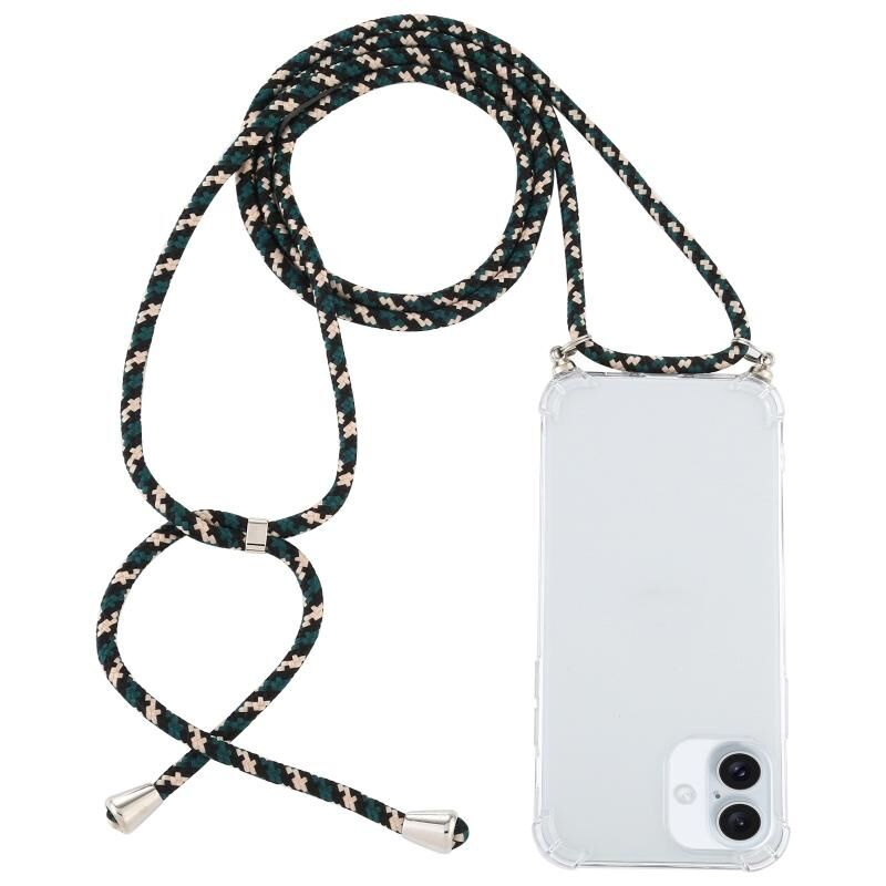 For iPhone 16 Four-Corner Shockproof Transparent TPU Case with Lanyard(Green Black)