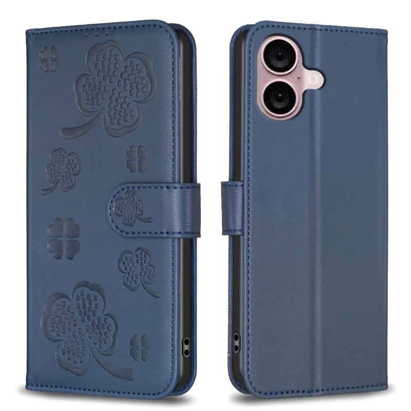 For iPhone 16 Four-leaf Embossed Leather Phone Case(Blue)
