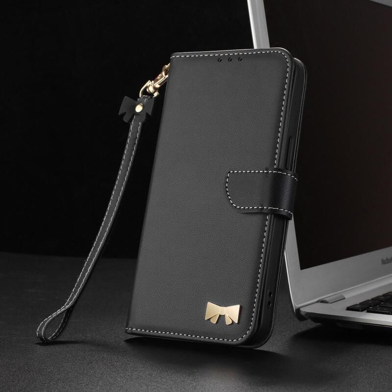 For iPhone 16 Metal Bow Leather Phone Case with Hand Strap(Black)