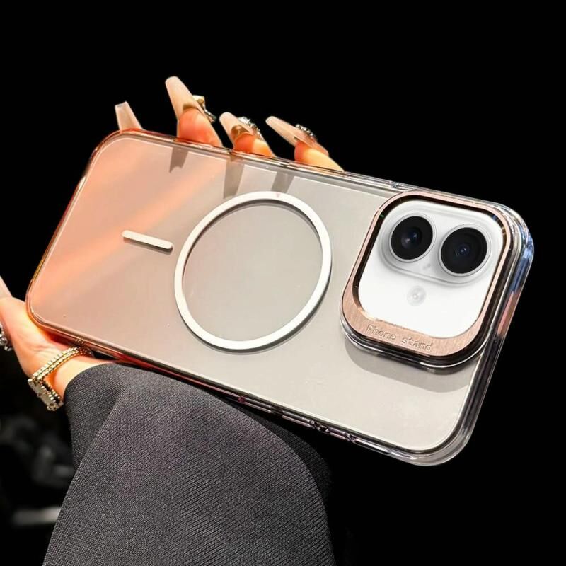 Θήκη τηλεφώνου για iPhone 16 με μεταλλικό φακό, αναδιπλούμενο στήριγμα, διαβαθμισμένο χρώμα, αντικραδασμική, με MagSafe (Ροζ)