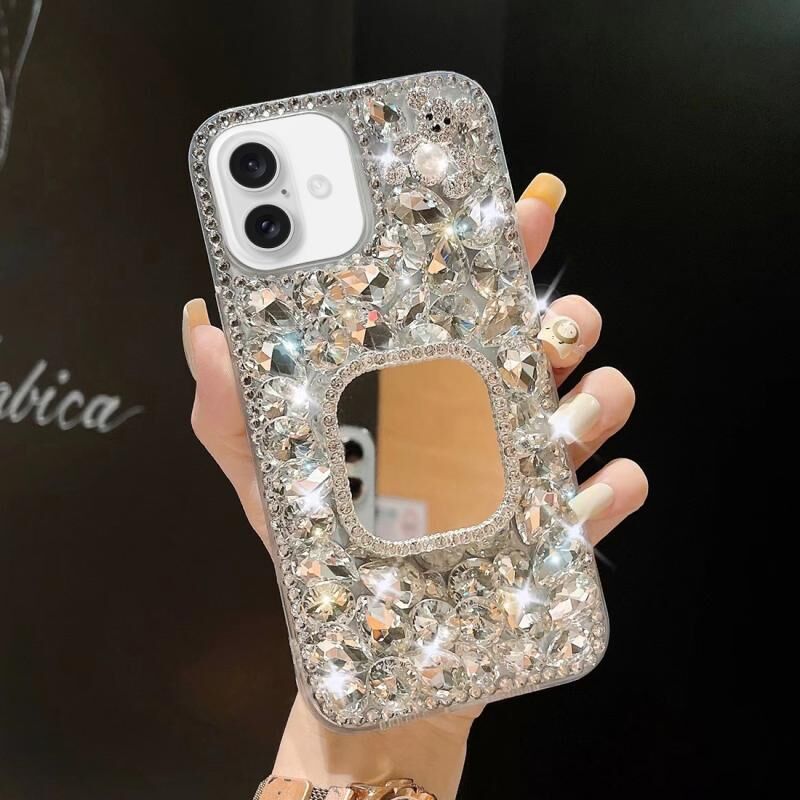 For iPhone 16 Mirror Handmade Bling Rhinestone PC Phone Case(Silver Gray Square)