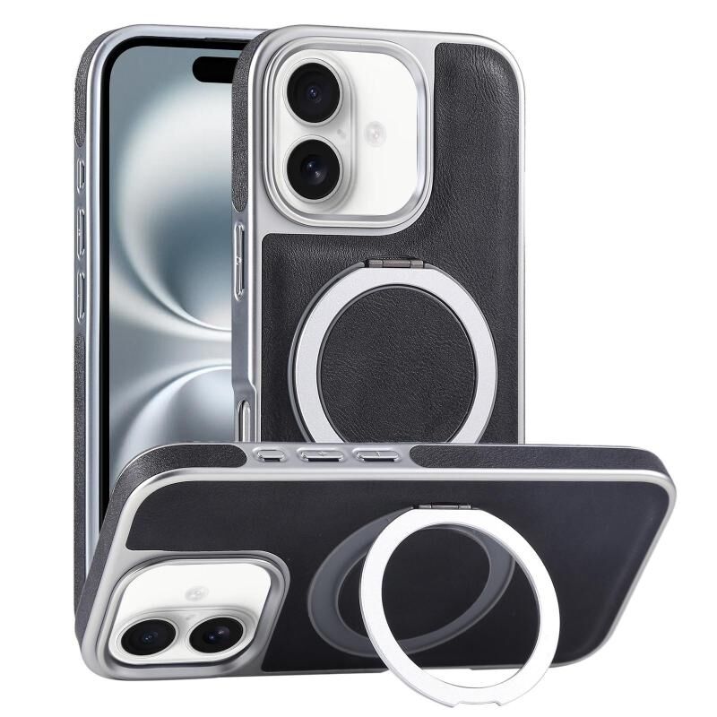 For iPhone 16 Plated Leather Grain Rotation MagSafe Holder Phone Case(Black)