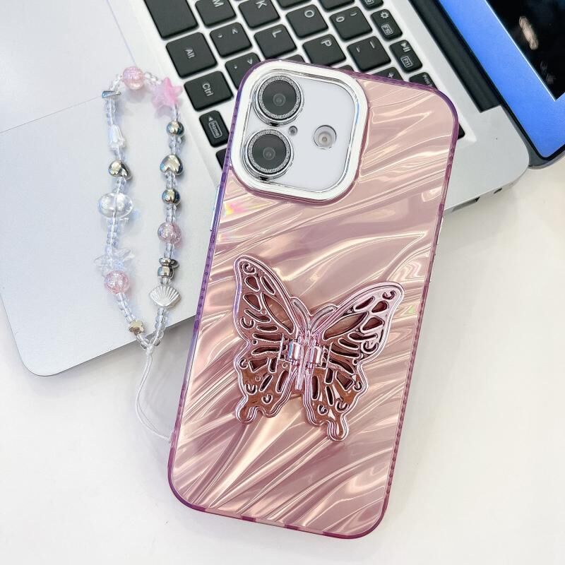 For iPhone 16 Plating Glitter Lens Film Texture Butterfly Holder Wristband Phone Case(Pink Water Ripples)